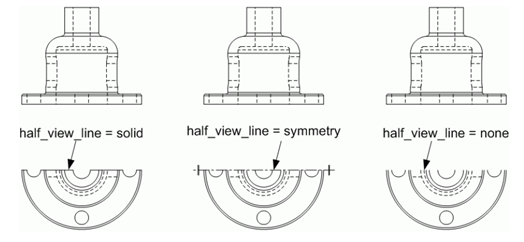 ❄ half_view_line:指定半视图的分界线型式,cns 规定是采用中心线。其选项如下:(1) solid:分界线为实线、(2) symmetry:绘制一条延伸出零件外的中心线,作为分界线、 (3) none:在分界线外一小段距离处绘制对象(注意︰设置为 none 时,建议从位移超过实际中心线的基准平面处切割视图,如此基准轴便可显示出来,且零件中心线的位置亦会清晰)。