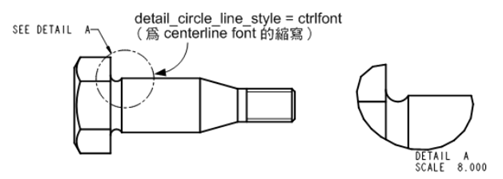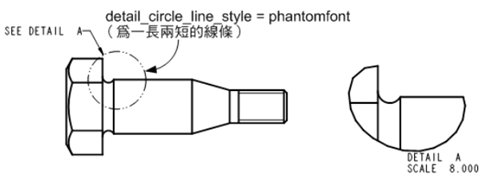 ❄ detail_circle_line_style:设置局部详图的边界圆的线型。其默认选项为 solidfont,代表边界圆为实线,其它选项包括 dotfont、ctrlfont、phantomfont、dashfont 等,如下图所示: